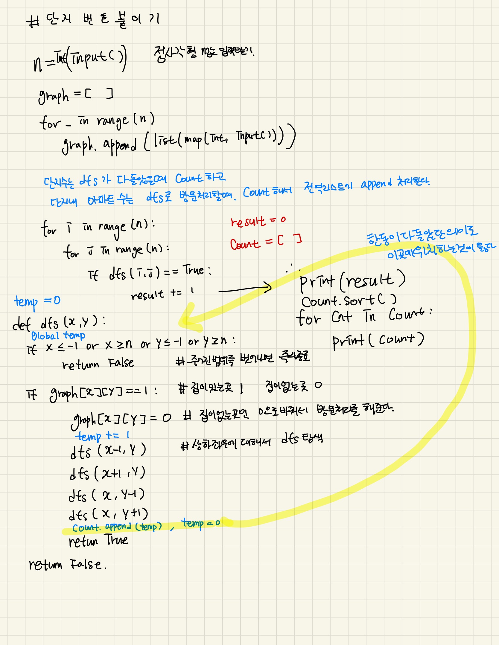 count_list.append(temp) # dfs 탐색이 끝났다면 단지내 아파트수 (temp)를 count_list에 append 후 temp 초기화